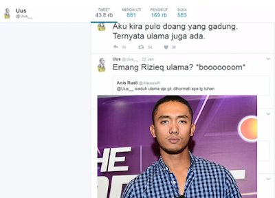 “Emang Rizieq ulama? *boooooom*,” tulis Uus di twitternya.